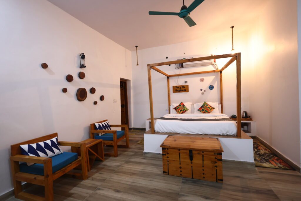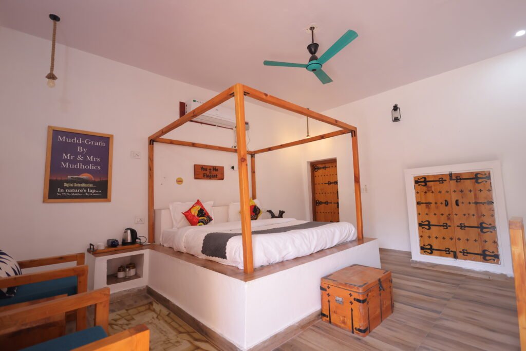 Relax in beautifully crafted mudhouse rooms that blend rural charm with modern comfort.